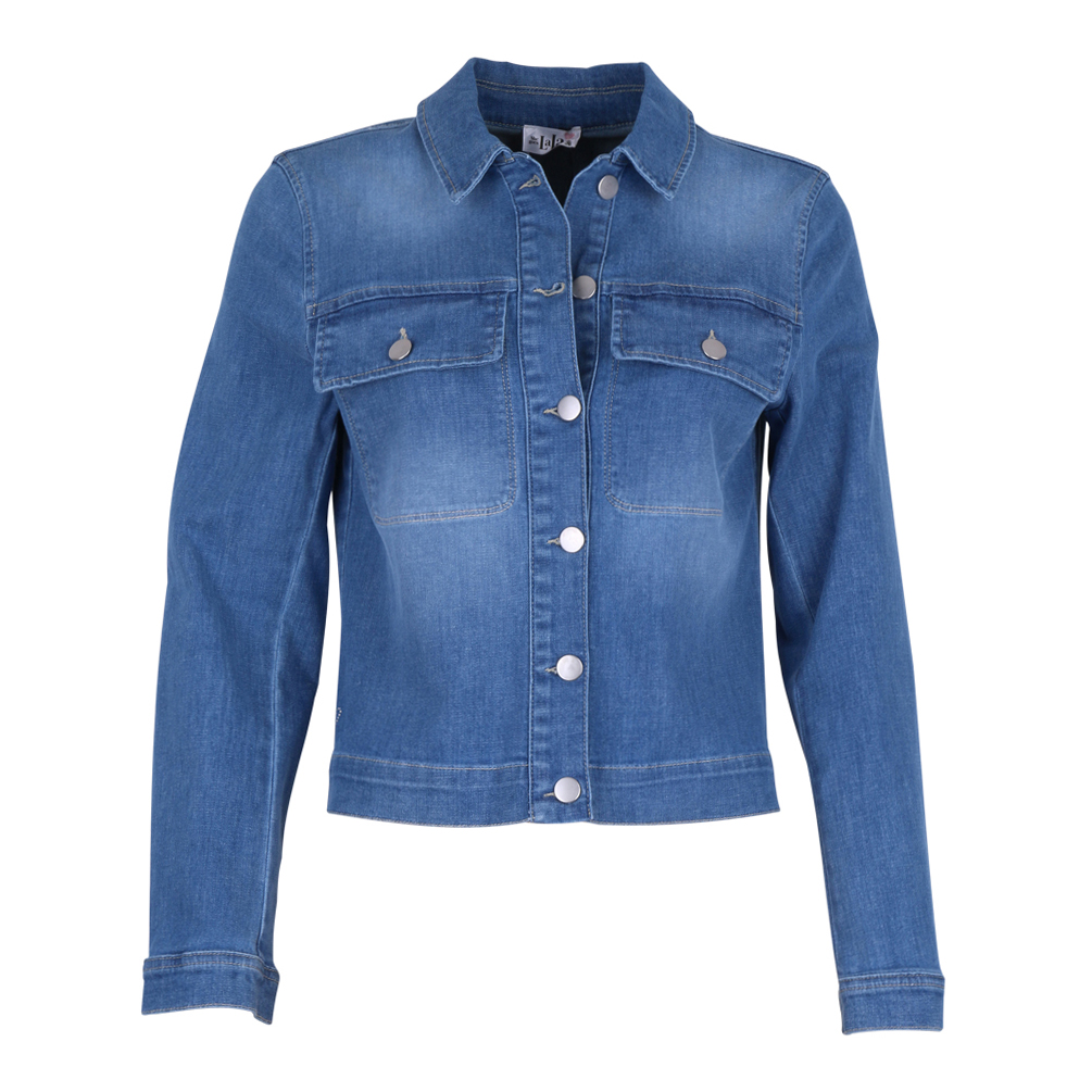 Jeans jasje met knoop sluiting en kraagje. Heeft 2 borstzakjes